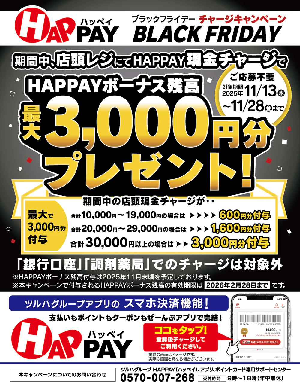 2025/11/13~11/28 BLACK FRIDAY HAPPAYチャージキャンペーン 店頭チャージで最大3,000円分のHAPPAYボーナスがもらえる!