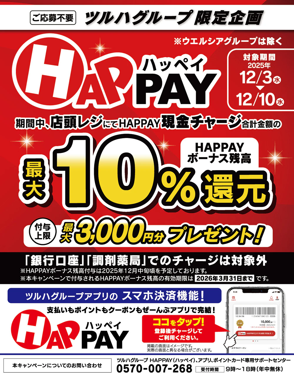 2025/12/3~12/10 店頭HAPPAYチャージで最大3,000円分のHAPPAYボーナスがもらえる!!