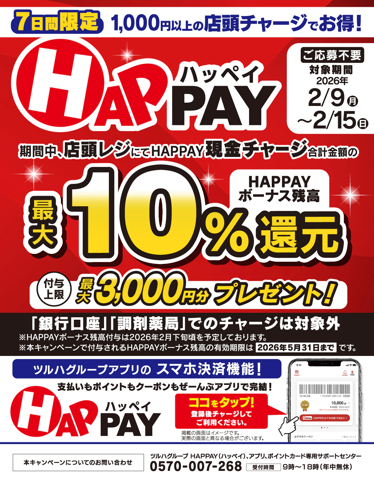 2026/2/9~2/15 【7日間限定!】1,000円以上の店頭チャージでお得!最大3,000円分のHAPPAYボーナスがもらえる!!