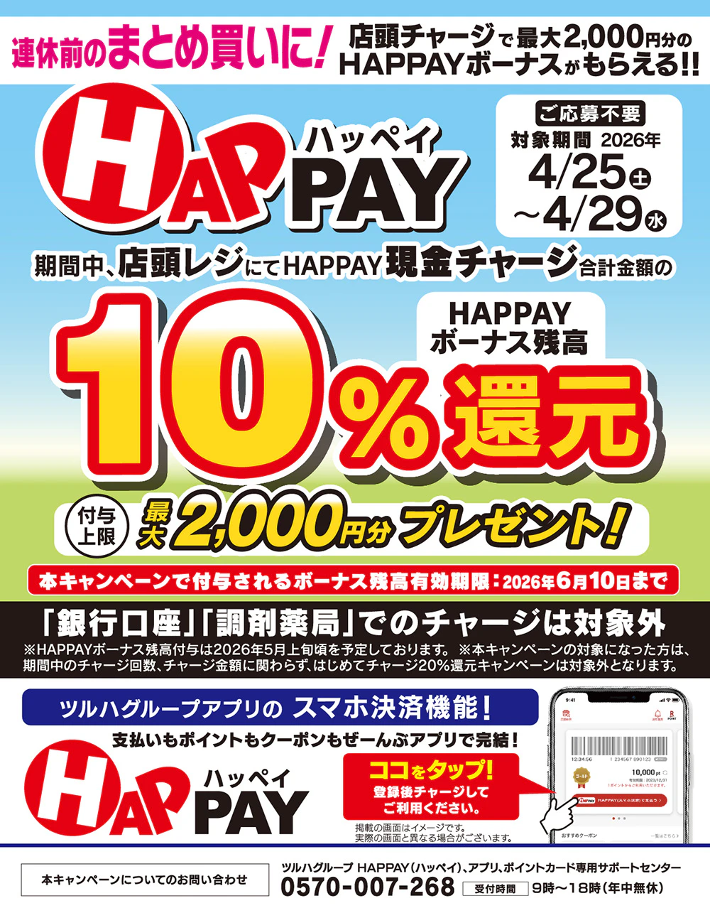 2026/4/25~4/29 連休前のまとめ買いに!HAPPAYへの店頭チャージで10%還元!最大2,000円分のボーナスがもらえる!!