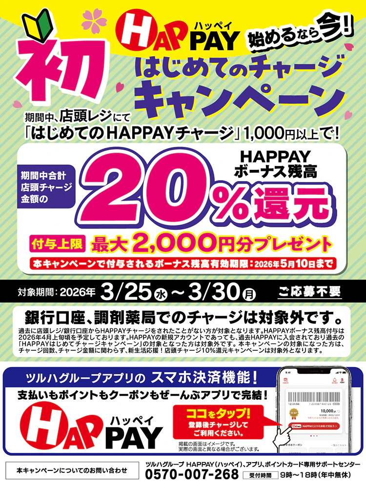 2026/3/25~3/30 始めるなら今!はじめての店頭チャージで20%還元!最大2,000円分のHAPPAYボーナスがもらえる!!