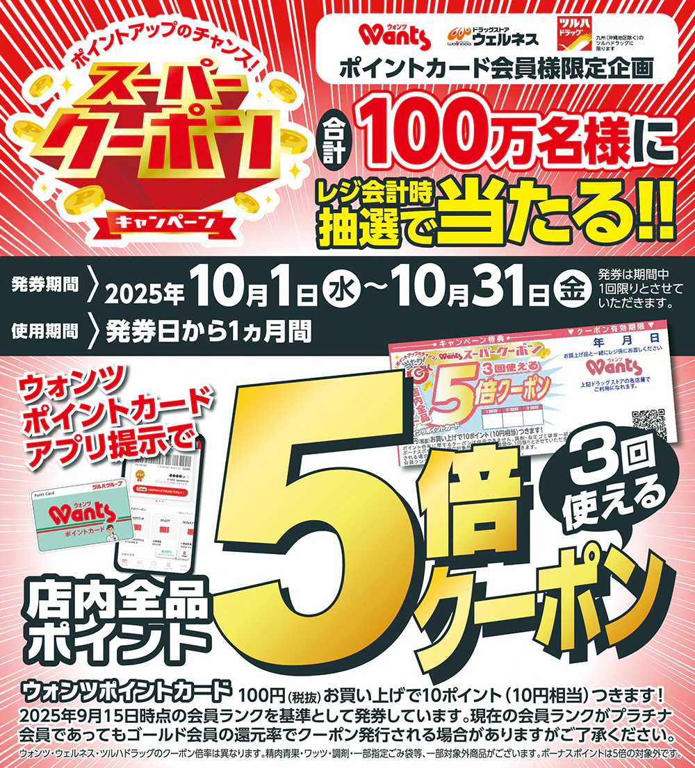 お買い物の際、ウォンツアプリ、または、ポイントカードをご提示いただくと、レジでのお会計時、ウォンツ、ドラッグストアウェルネス、九州(沖縄地区除く)のツルハドラッグのポイントカード会員様の中から、抽選で100万名様に、「3回使えるポイント5倍クーポン」が当たります!