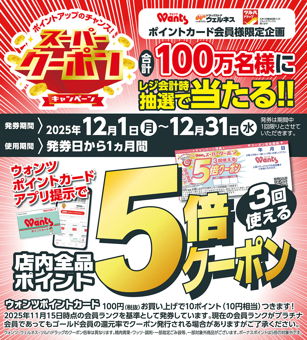 お買い物の際、ウォンツアプリ、または、ポイントカードをご提示いただくと、レジでのお会計時、ウォンツ、ドラッグストアウェルネス、九州(沖縄地区除く)のツルハドラッグのポイントカード会員様の中から、抽選で100万名様に、「3回使えるポイント5倍クーポン」が当たります!