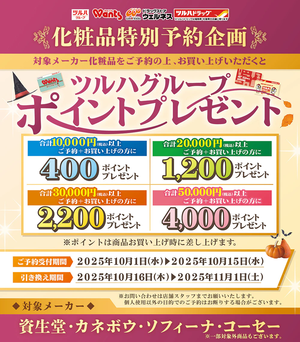 ご予約受付期間中に資生堂・カネボウ・ソフィーナ・コーセーの化粧品をご予約の上、引き換え期間にお買い上げいただくとお買上げ金額に応じて規定のポイントをプレゼントいたします!