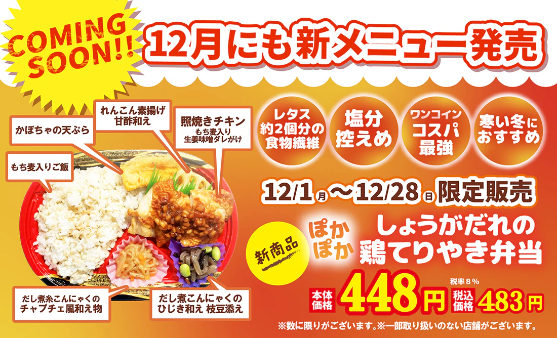 12月限定発売の「ぽかぽかしょうがだれの鶏てりやき弁当」をお楽しみに!