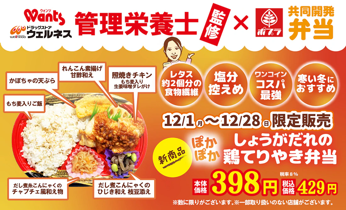 2025年12月1日(月)、ウォンツの管理栄養士監修、ポプラ様と共同開発のお弁当が発売されました!